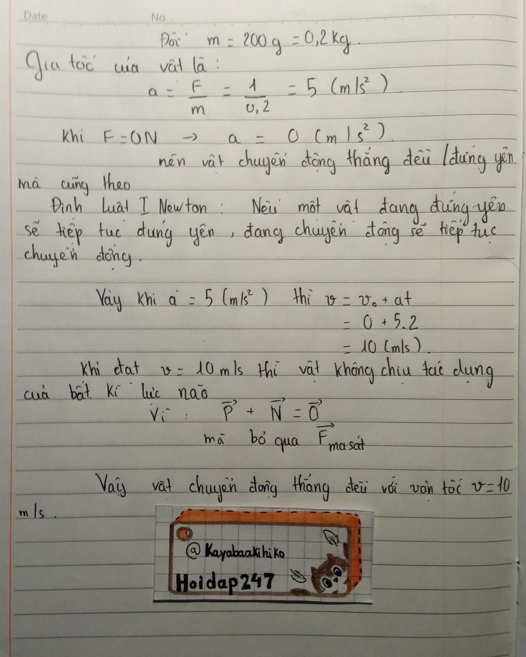 + `F=0` và bỏ qua lực ma sát ⇒ hợp lực tác dụng lên vật bằng `0` ⇒ vật chuyển động thẳng đều với vận tốc $v=10 \ m/s$