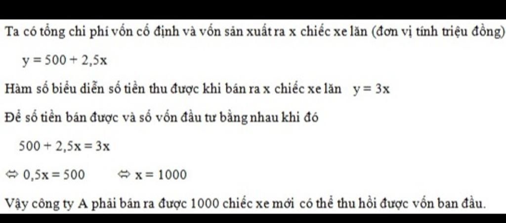 với sự phát triển của khoa học hiện nay, người ta tạo ra nhiều mẫu xe lăn đẹp và tiện dụng cho nhười khuyết tật . Công ty A đã sản xuất ra những chiếc xe lăn cho người khuyết tật với vốn ban đầu là 500 triệu đồng (để mua máy móc , thiết bị , thuê nhà xưởng) chi phí để sản xuất ra 1 chiếc xe lăn là 2,5 triệu đồng . Giá bán mỗi chiếc xe là 3 triệu đồng.