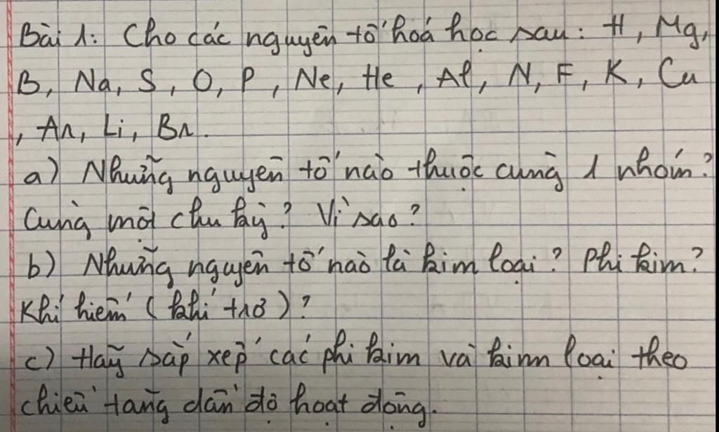 Bài 1: cho các nguyên tố hóa học sau: H, Mg,