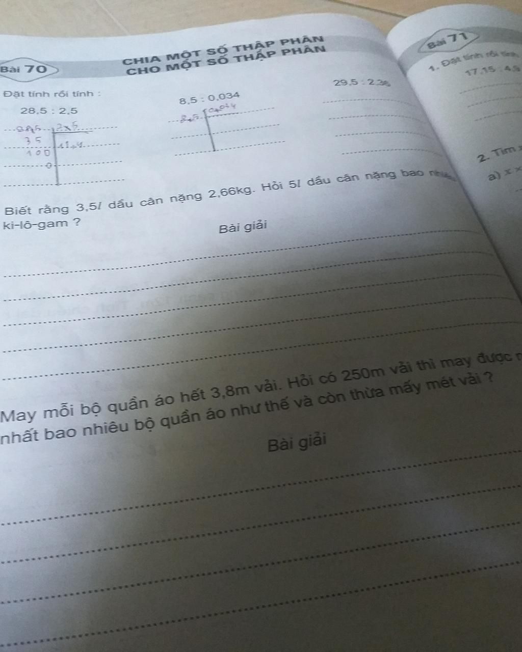 May mỗi bộ quần áo hết 3,8m vải. Hỏi có 250m vải t ...