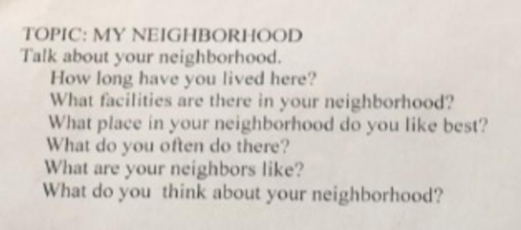 I live in a neighborhood that is good and nice. I have been living here for 10 years and it is just a stone's throw away from the beach. My neighborhood is quite large so it has many facilities likeshops,markets,parks,etc. But one of the places in my neighborhood that I like best is the park. Not only is it a place to play in but it is also a place that I often come to look for some privacy and comfort. Additionally, my neighbors are very good people. They are really helpful when we need them and they are also friendly and hospitable. To be frank, my neighborhood is one of things that I love and of course, I will always miss it whenever I am away.