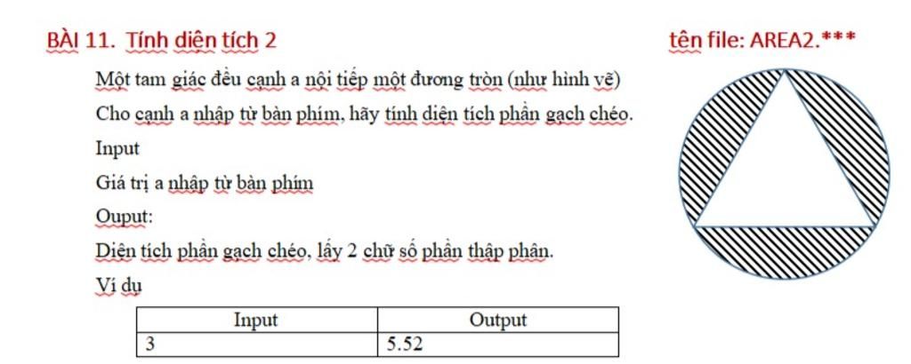 - Diện tích hình tròn: `S2 = 3,14r^2 = 3,14.((asqrt{3}) / 3)^2`