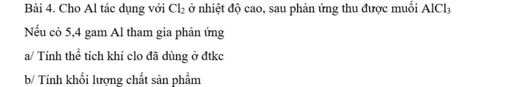 $\text{ PTHH : 2Al + 3$Cl_{2}$ $\xrightarrow{t^o}$ $2AlCl_{3}$ }$