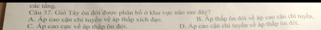 Đề bài: Gió tây ôn đới được phân bố ở khu vực nào sau đây?