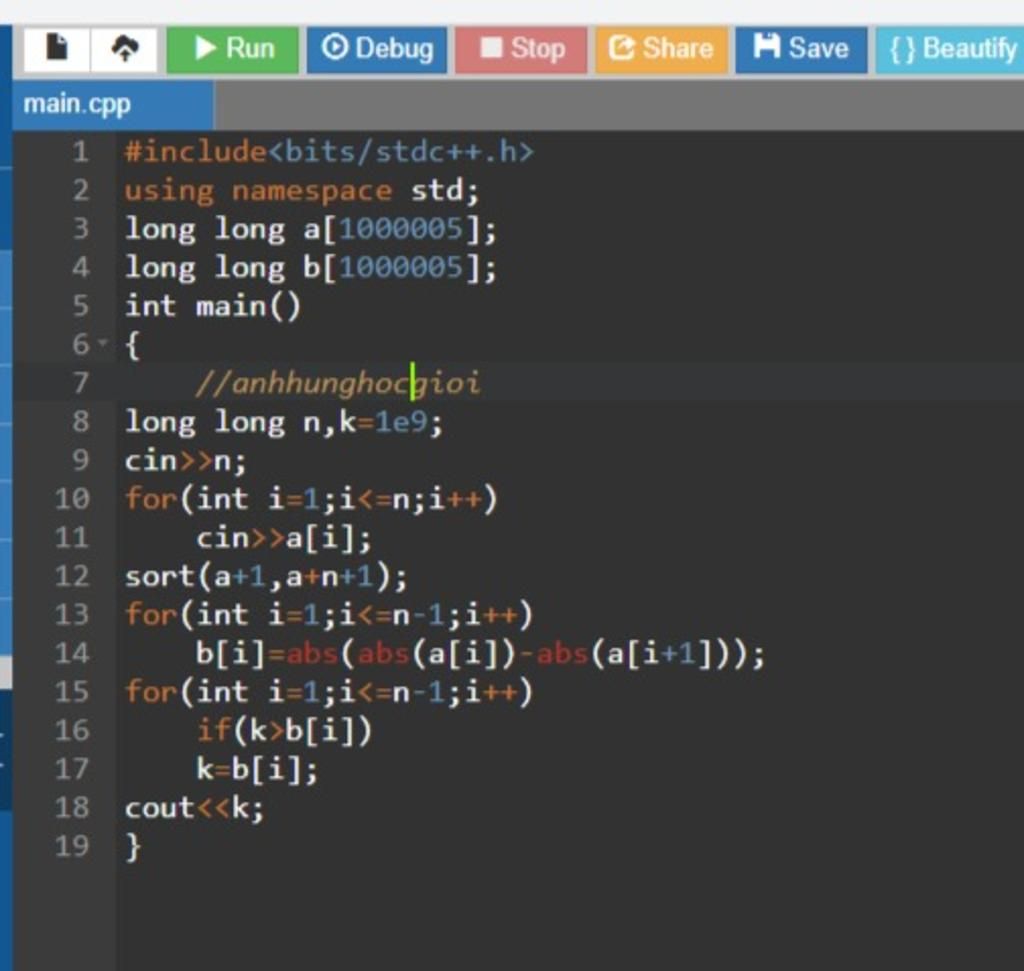 #include<bits/stdc++.h> using namespace std; long long a[1000005]; long long b[1000005]; int main() { long long n,k=1e9; cin>>n; for(int i=1;i<=n;i++) cin>>a[i]; sort(a+1,a+n+1); for(int i=1;i<=n-1;i++) b[i]=abs(abs(a[i])-abs(a[i+1])); for(int i=1;i<=n-1;i++) if(k>b[i]) k=b[i]; cout<<k; } Rút gọn#include<bits/stdc++.h> using namespace std; long long a[1000005]; long long b[1000005]; int main() { long long n,k=1e9; cin>>n; for(int i=1;i<=n;i++) cin>>a[i]; sort(a+1,a+n+1); for(int i=1;i<=n-1;i++) b[i]=abs(abs(a[i])-abs(a[i+1])); for(int ... xem thêm