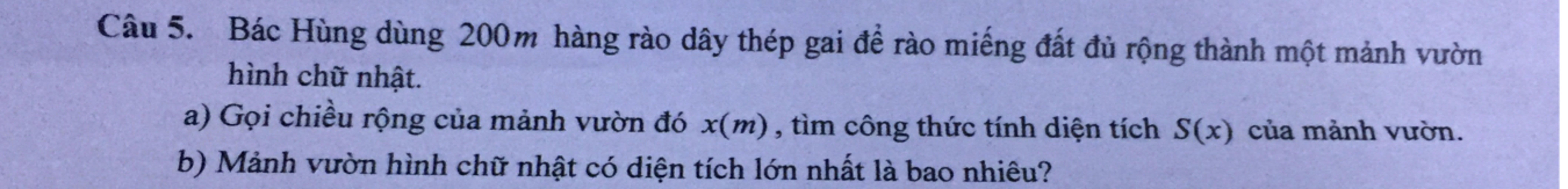 Câu 5. Bác Hùng dùng 200m hàng rào dây thép gai để rào miếng