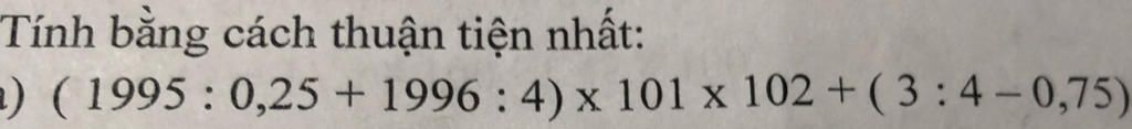 `= ( 1995 : 0,25 + 1996 : 4 ) xx 101 xx 102 xx ( 3/4 - 0,75 )`