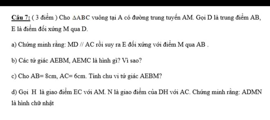 Câu 7: ( 3 điểm ) Cho AABC vuông tại A có đường trung tuyến AM. Gọi D là trung