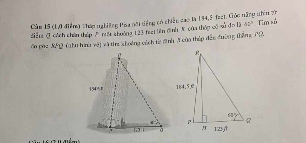Đề bài là điểm Q cách chân tháp P một khoảng bằng 123 ft ạ