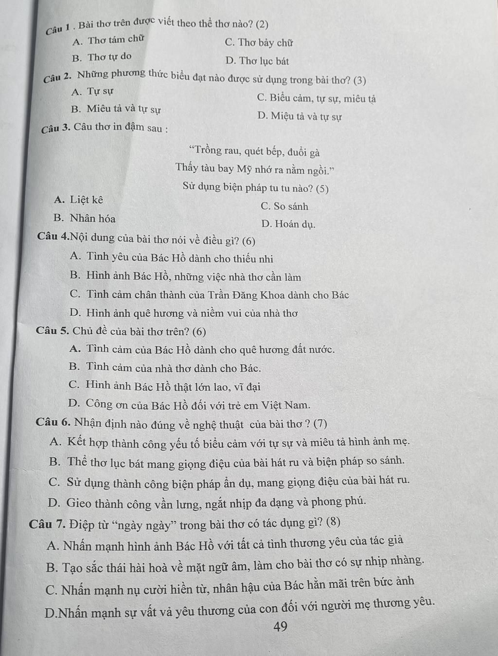 - Câu 4, 5 là A vì Bác trong bài thơ luôn quan tâm đến đất nước, thiếu nhi: " Cháu ơi đừng có chơi bời đâu xa; Trồng rau, quét bếp, đuổi gà; Thấy tàu bay Mỹ nhớ ra nằm ngồi' .