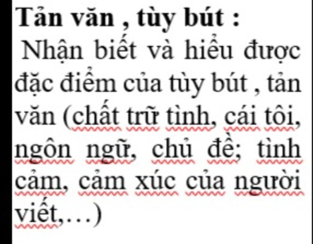 -Tản văn Là loại văn xuôi ngắn gọn, hàm súc có cách thể hiện đa dạng (trữ tình, tự sự, nghị luận, miêu tả,...), nhưng nhìn chung đều mang tính chất chấm phá, bộc lộ trực tiếp suy nghĩ, cảm xúc của người viết qua các hiện tượng đời sống thường nhật, giàu ý nghĩa xã hội.