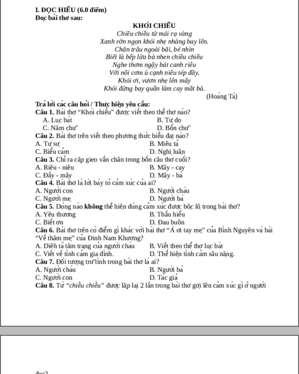 Câu `1` : Bài thơ "Khói chiểu" viết theo thể thơ :