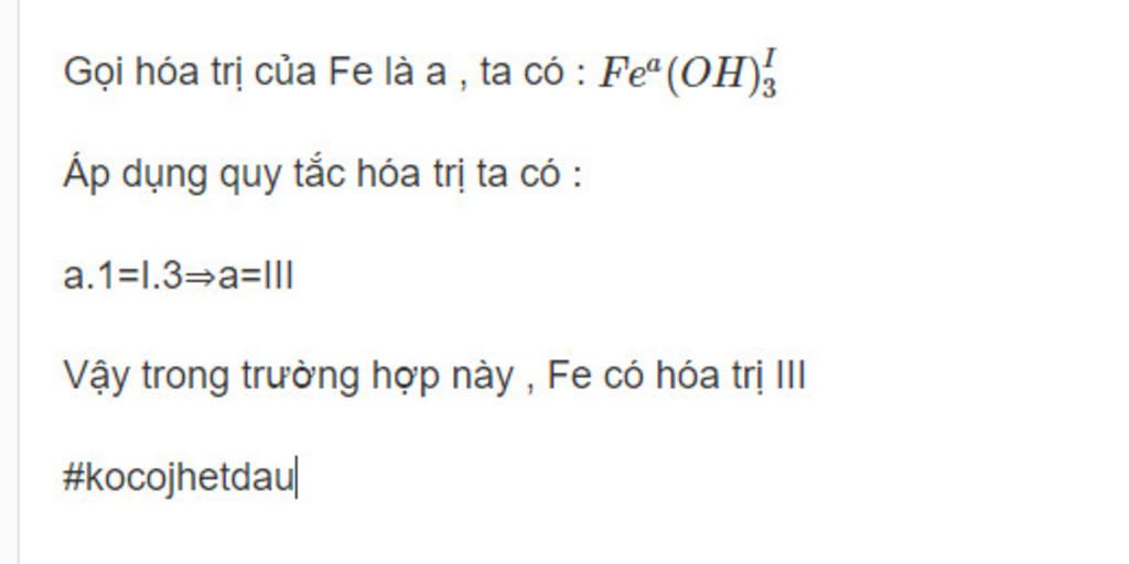`to`Vậy hoá trị của $Fe$ trong `Fe(OH)_3` là `III`