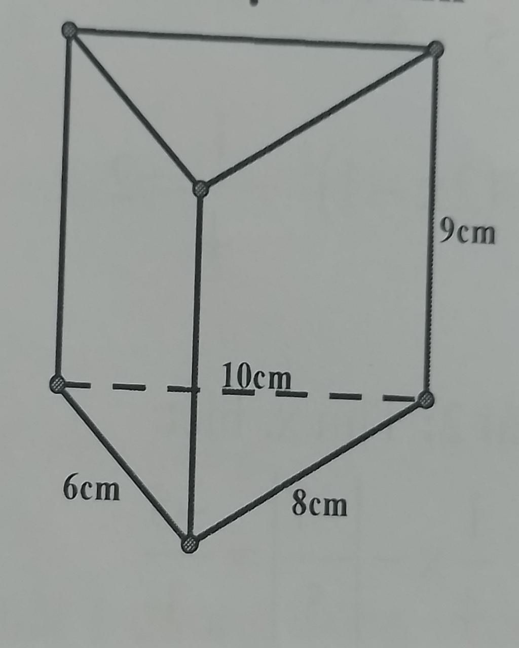 Cho hình lăng trụ đứng như hình vẽ có đáy là một tam giác có kích thước các cạnh lần lượt là 6 cm;8 cm;10 cm;chiều cao của lăng trụ là 9 cm.Hãy tính diện tích toàn phần của hình lăng trụ