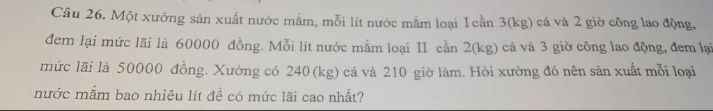 Câu 26. Một xưởng sản xuất nước mắm, mỗi lít nước mắm loại Icần 3(kg) cá và 2 giờ công lao động,