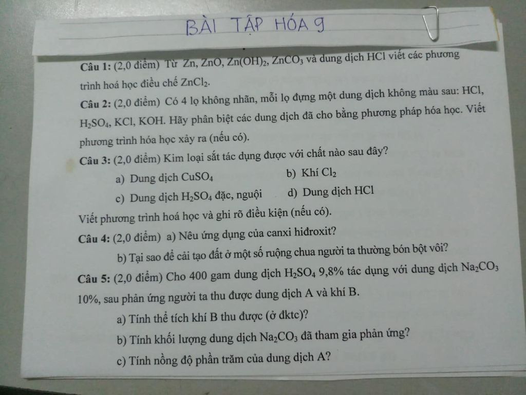 Câu 1: (2,0 điểm) Từ Zn, ZnO, Zn(OH)2, ZNCO3 và dung dịch HCl viết các phương