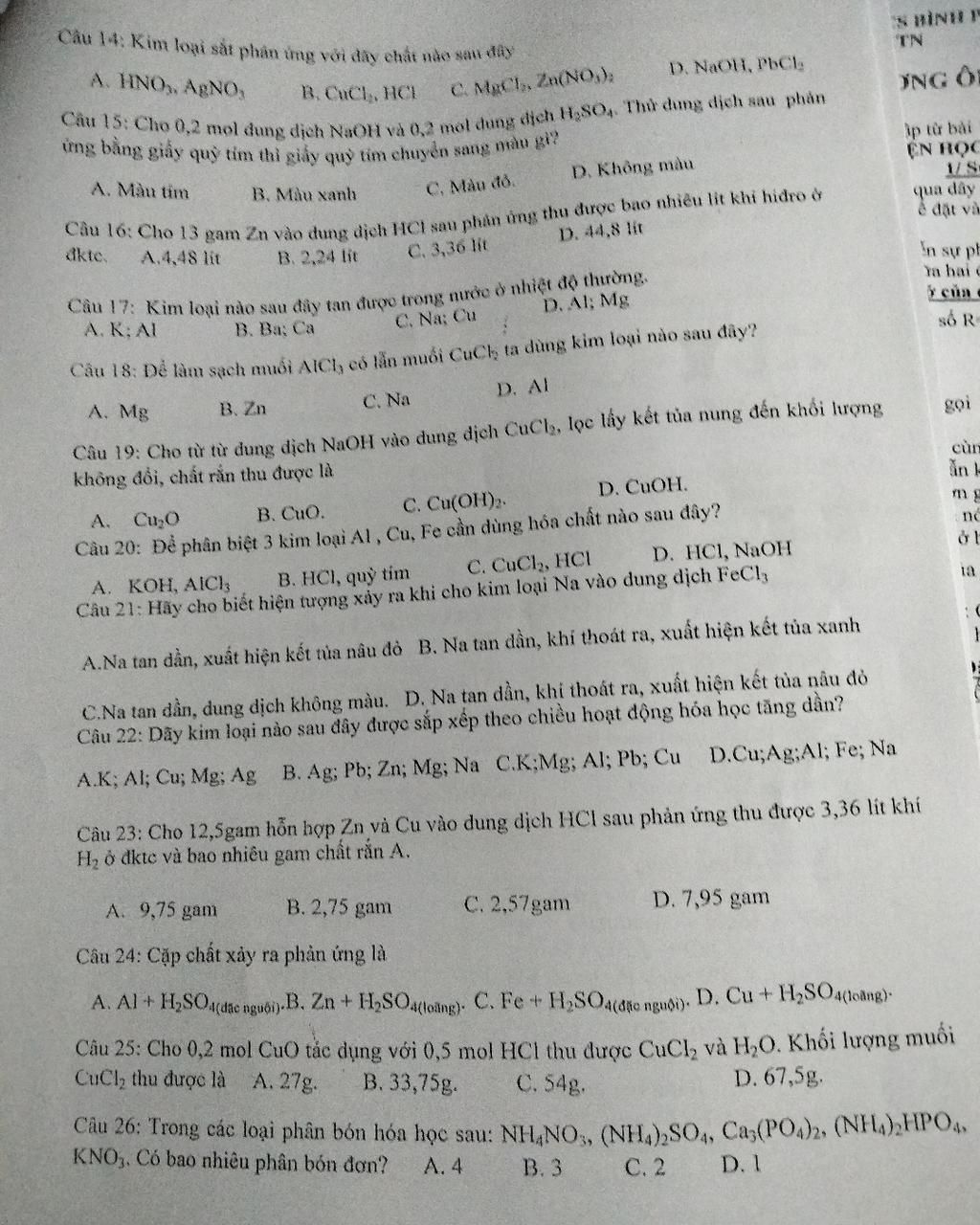 Câu 15: Cho 0,2 mol dung dịch Nao và 0, "mal dung dịch IESO,. Thủ dung dịch sau phản