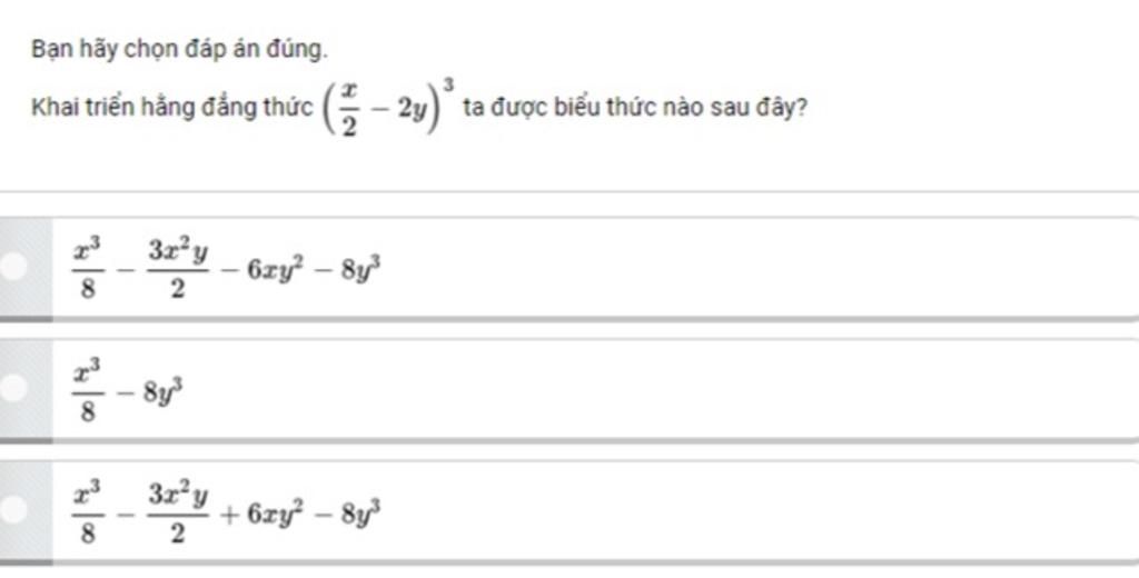 `=(\frac{x}{2})^{3}-3.(\frac{x}{2})^{2}.2y+3.\frac{x}{2}.(2y)^{2}-(2y)^{3}`