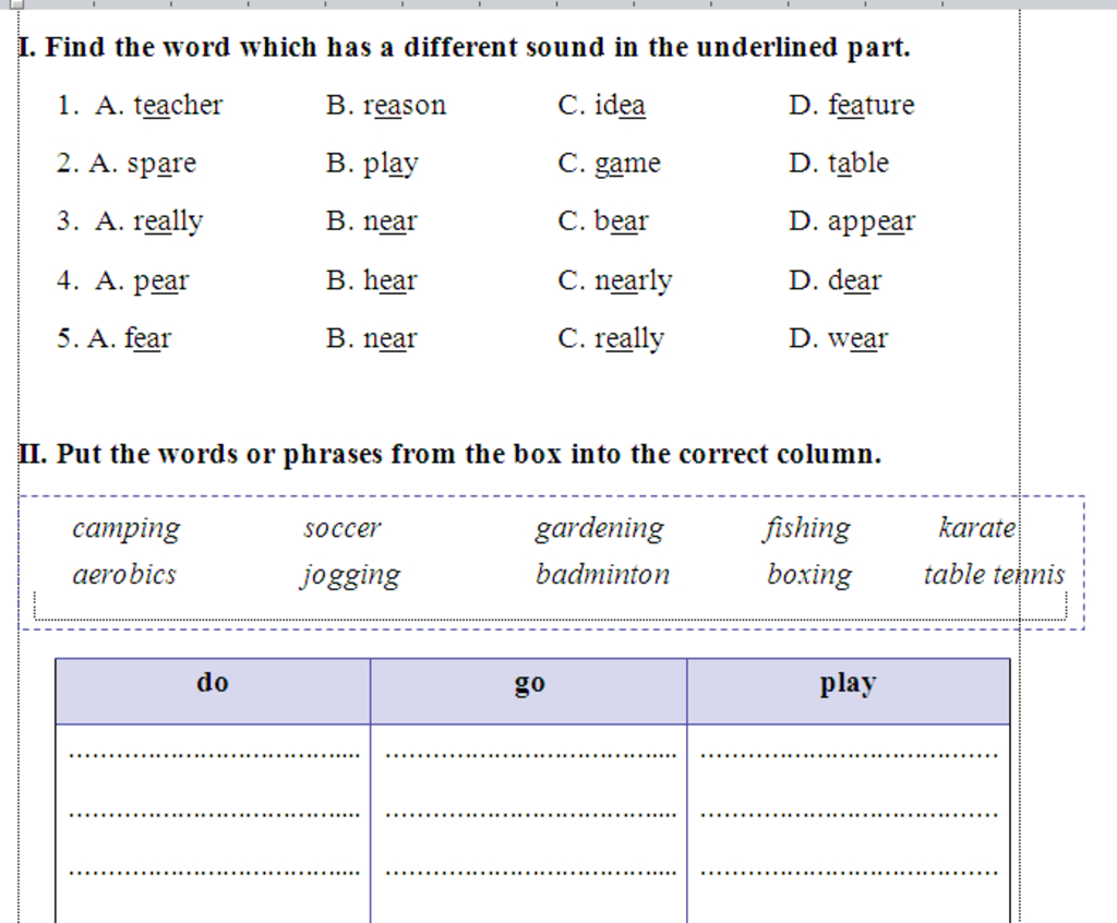 do: gardening, aerobics, go: camping, fishing play: soccer, karate, jogging, badmintonn, boxing, table tenni