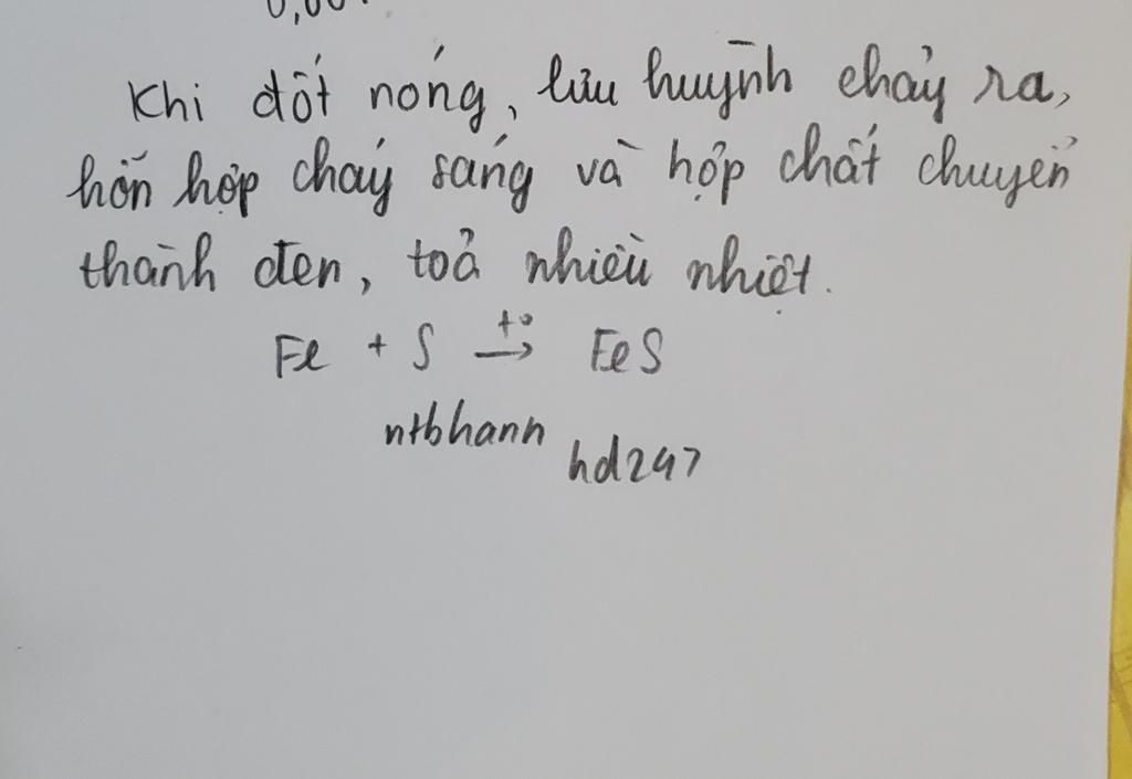 Hiện tượng : kim loại sắt tác dụng với bột lưu huỳnh rồi đốt nóng hỗn hợp . khi đốt nóng hỗn hợp , lưu huỳnh nóng chảy , hỗn hợp cháy sáng và bắt đầu chuyển thành hợp chất màu đen , tỏa nhiều nhiệt