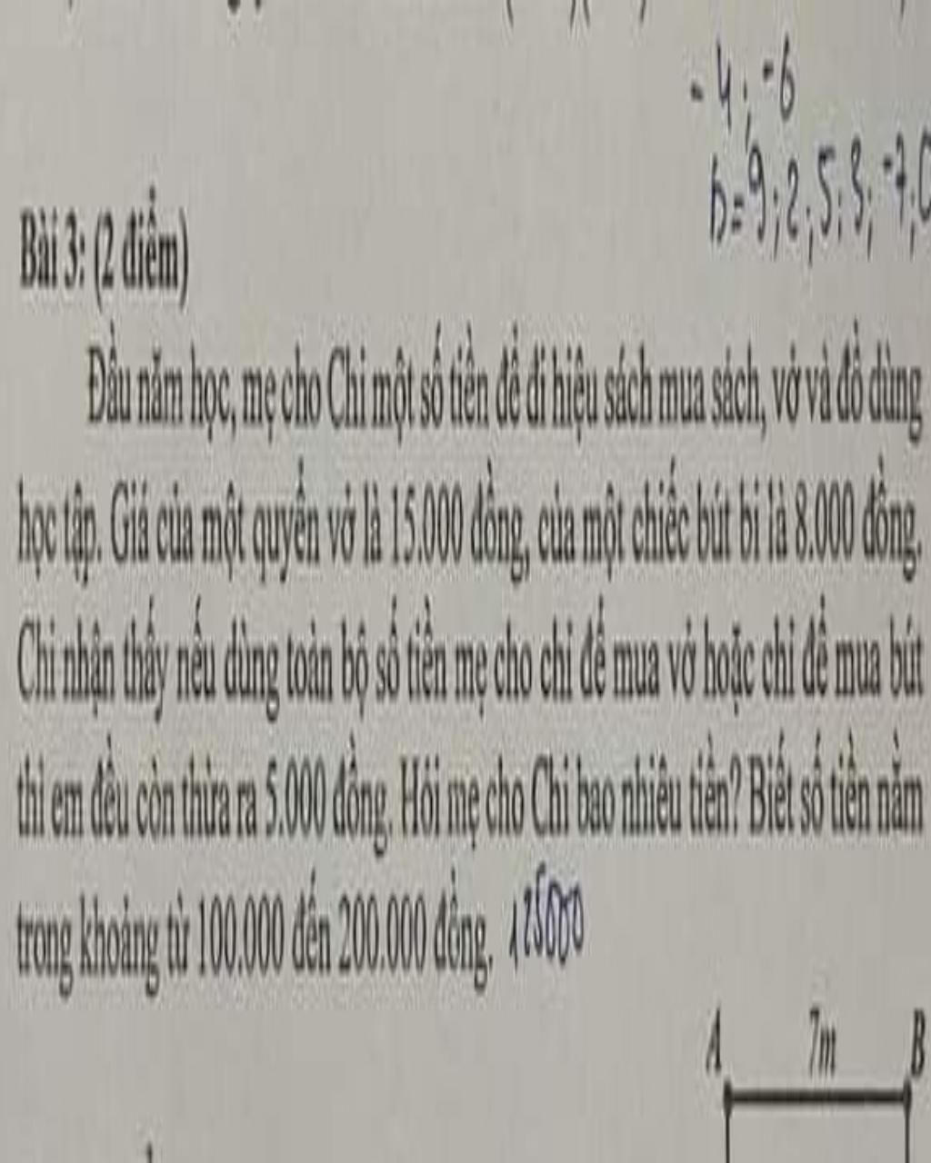 Đầu năm học, mẹ cho Chi một số tiền để đi hiệu sách mua sách, vở và đồ dùng học tập. Giả của một quyển vở là 15.000 đồng, của một chiếc bút bi là 8.000 đồng.Chi nhận thấy nếu dùng toàn bộ số tiền mẹ cho chỉ để mua vở hoặc chỉ để mua bútthì em đều còn thừa ra 5.000 đồng. Hỏi mẹ cho Chi bao nhiêu tiền? Biết số tiền nằmtrong khoảng từ 100.000 đến 200.000 đồng.