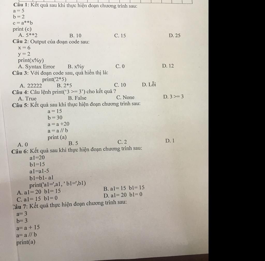 Câu 4: Câu lệnh print(‘3 >=3’) ...