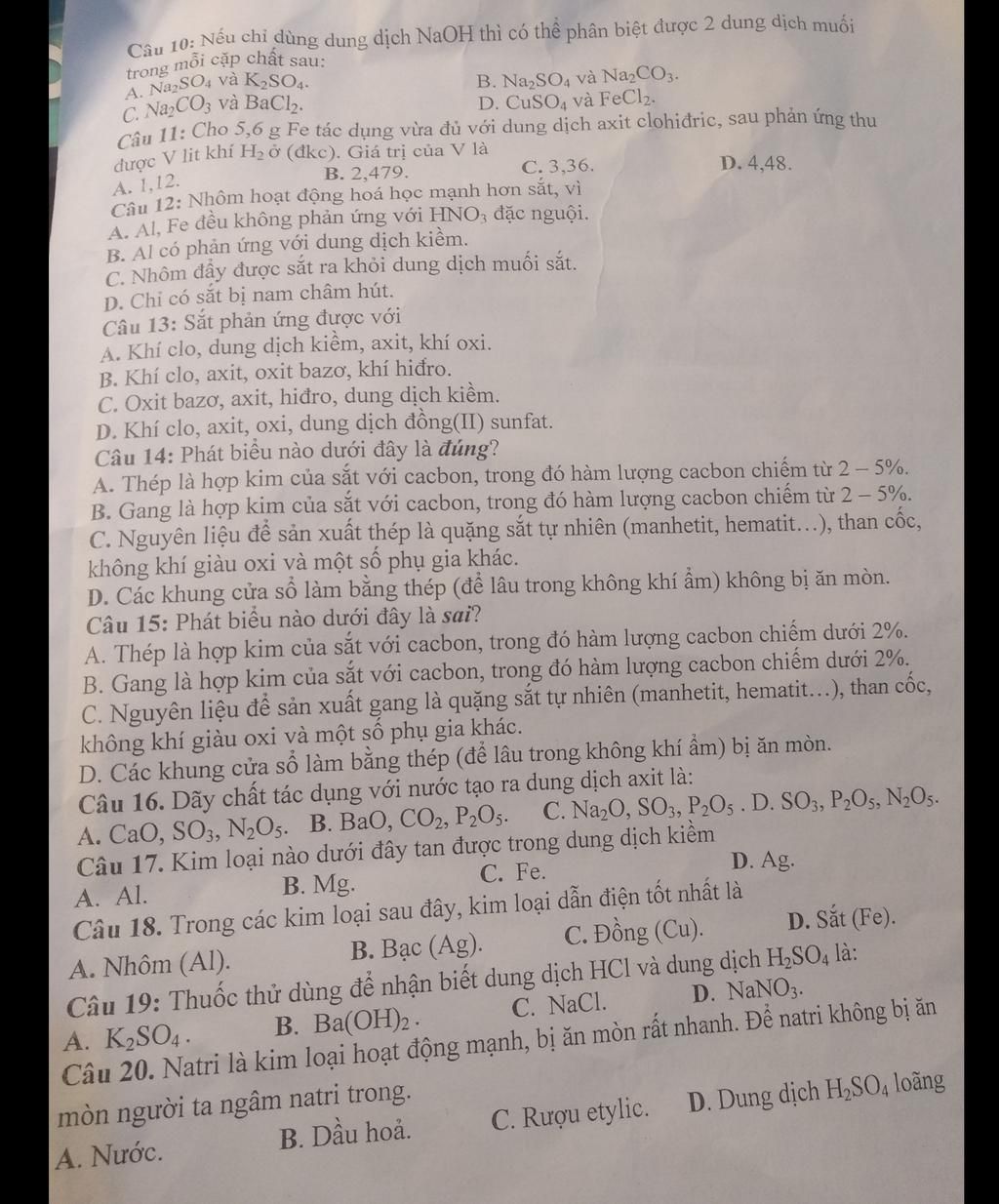 Câu 10: Nếu chỉ dùng dung dịch NaOH thì có thể phân biệt được 2 dung dịch muối