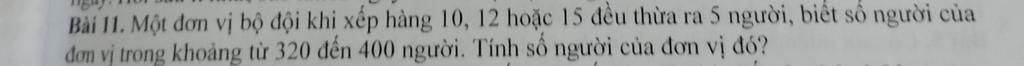 Gọi số bộ đội của đơn vị đó là x.Ta có : x : 10 dư 5 => x - 5 chia hết cho 10x : 12 dư 5 => x - 5 chia hết cho 12x : 15 dư 5 => x - 5 chia hết cho 15Vì x + 5 chia hết cho 10;12;15 => x + 5 ∈BC(10;12;15)Ta có :10 = 2.5 12 = 22.3 15 = 3.5=> BCNN(10;12;15) = 22.3.5=60=> BC(10;12;15) = { 0 ; 60 ; 120 ; 180 ; 240 ; 300 ; 360 ; 420 ; ...}Vì 300 <x <400 => x - 5 ∈∈{ 360 }=> x = 360 + 5 = 365.Vậy số bộ đội của đơn vị đó là 365