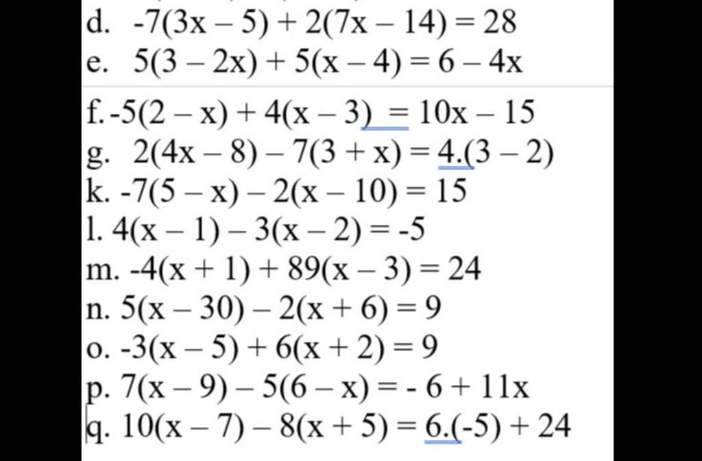 g. 2(4x-8)-7(3 + x) = 4.(3-2)