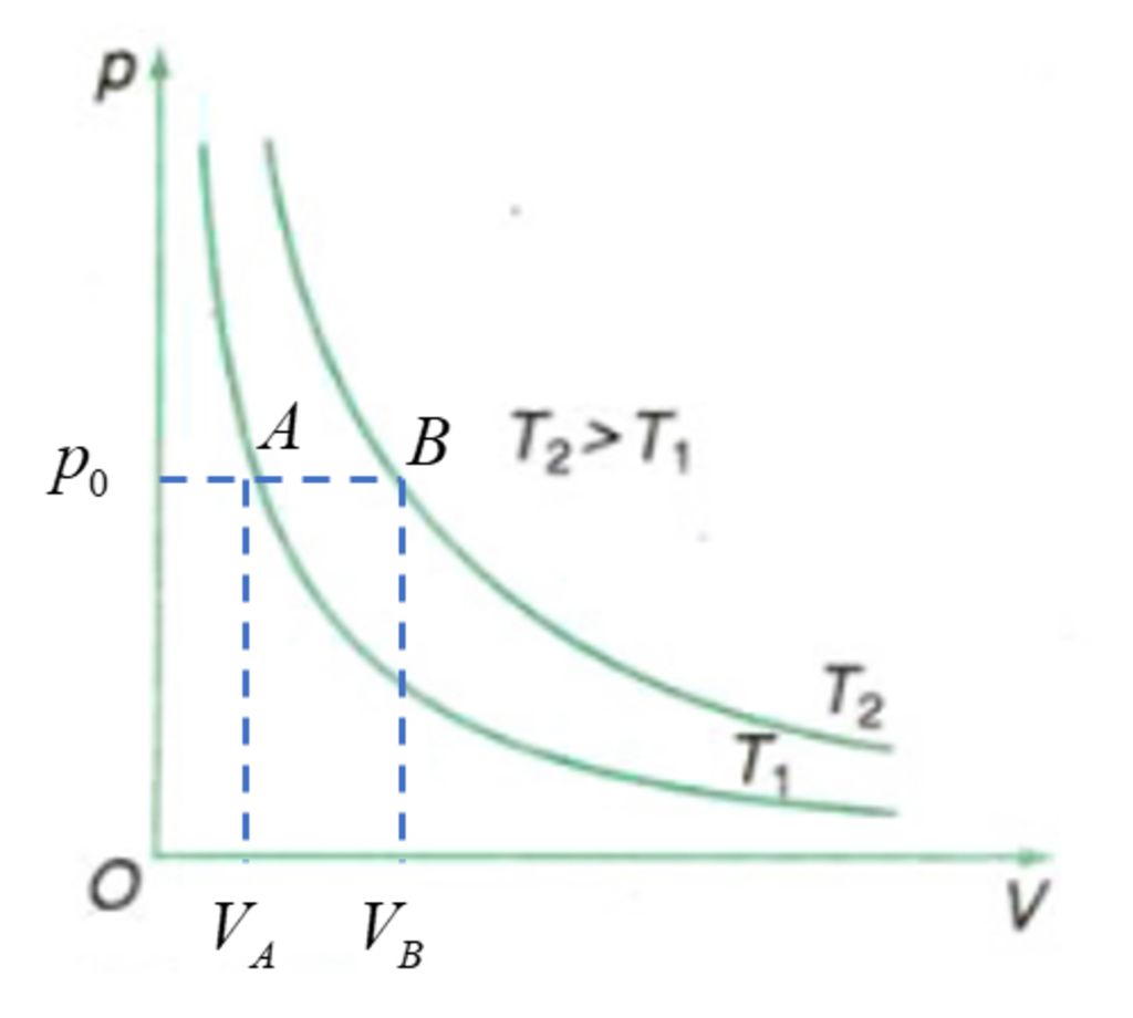 Theo phương trình trạng thái, ta có: \(\dfrac{{{p_0}{V_A}}}{{{T_A}}} = \dfrac{{{p_0}{V_B}}}{{{T_B}}}\) (2)