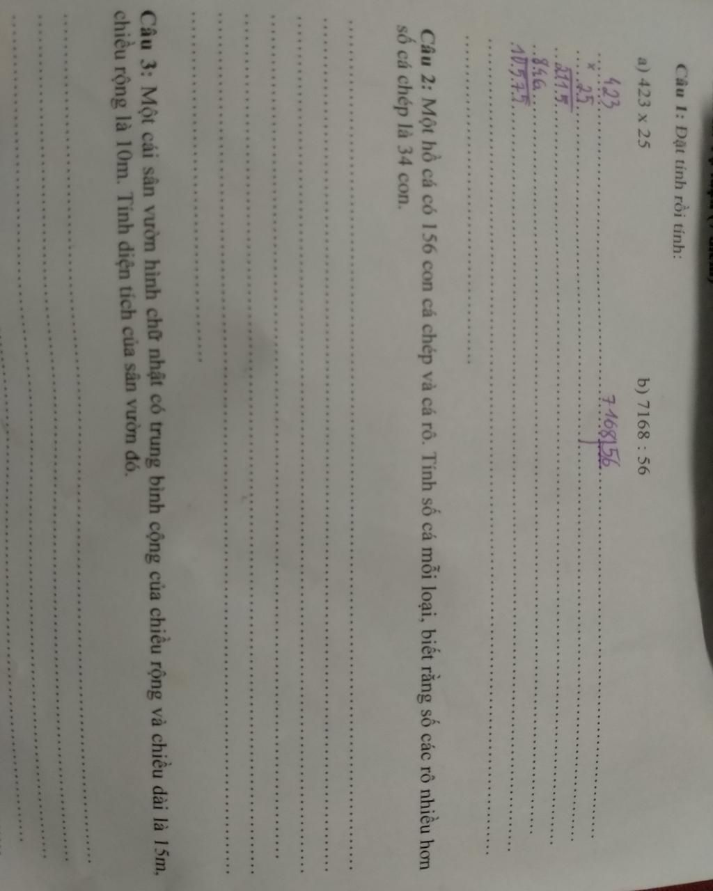 Câu 1b : Kết quả là 128 . Câu 2 : Số cá chép trong hồ là : ( 156 - 34 ) : 2 = 61 (con) Số cá rô trong hồ là : 156 - 61 = 95 (con) Đáp số: Cá rô: 95 con Cá chép: 61 con Câu 3: Nửa chu vi của sân vườn là: 15 x 2 = 30 (m) Chiều dài của sân vườn hình chữ nhật là: 30 - 10 = 20 (m) Diện tích của sân vườn là: 20 x 10 = 200 (m²) Đáp số: 200 m² Rút gọnCâu 1b : Kết quả là 128 . Câu 2 : Số cá chép trong hồ là : ( 156 - 34 ) : 2 = 61 (con) Số cá rô trong hồ là : 156 - 61 = 95 (con) Đáp số: Cá rô: 95 con Cá chép: 61 con Câu 3: Nửa chu vi của sân vườn là: 15 x 2 = 30 (m) Chiều ... xem thêm