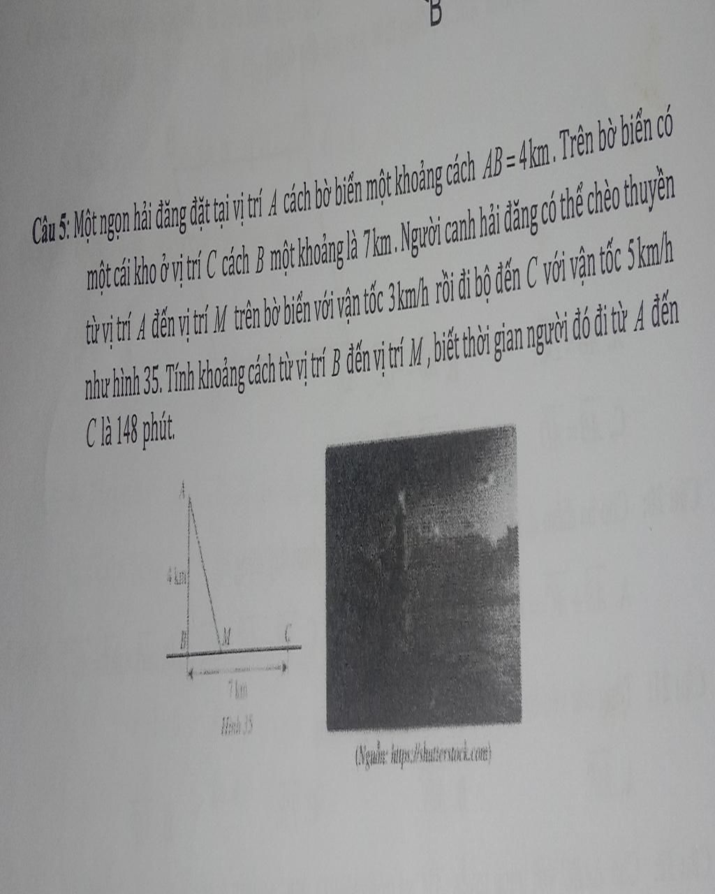 Câu 5: Một ngọn hải đăng đặt tại vị trí Á cách bờ biển một khoảng cách AB = 4km . Trên bờ biển có