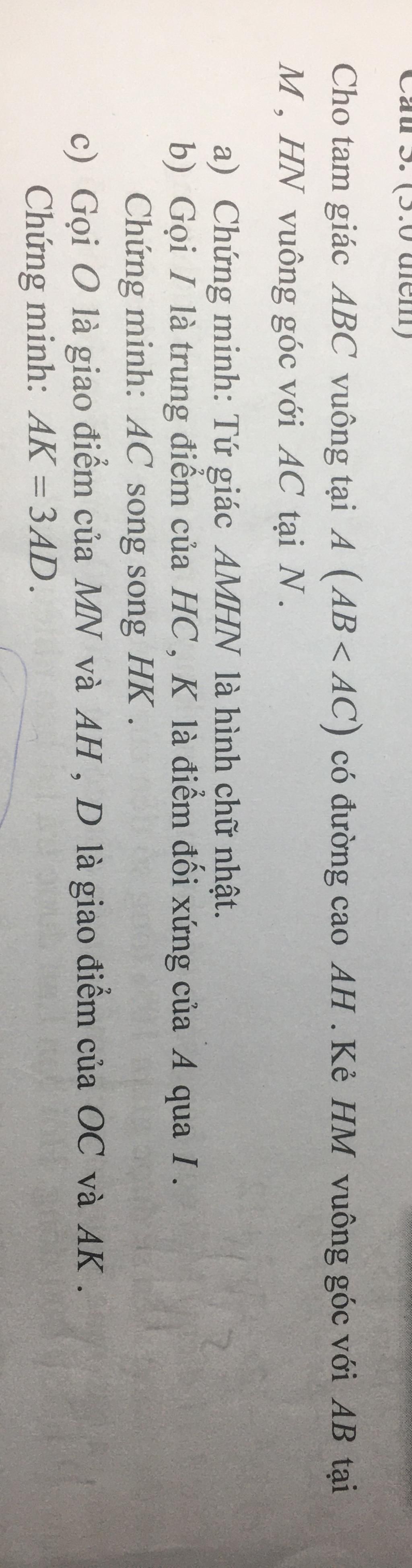 c) `AMHN` là hình chữ nhật `=> O` là trung điểm của `AH`