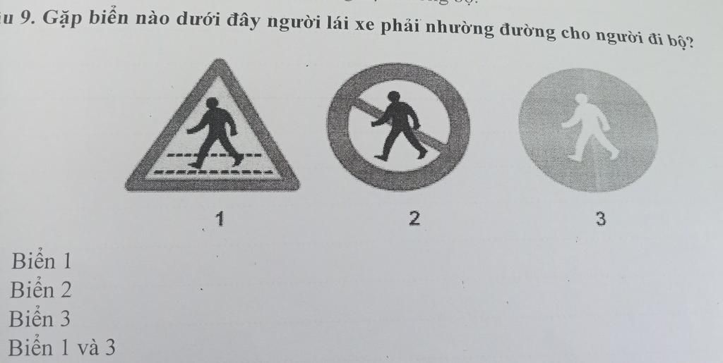 Biển 1 là biển cảnh báo dường người đi bộ cắt ngang, bắt buộc các phương tiện phải nhường đường. Biển 2 là biển cấm người đi bộ. Biển 3 là biển báo đường dành cho người đi bộ.