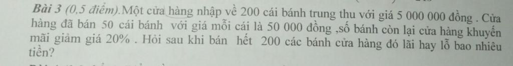 Ta thấy tổng số tiền của hàng bán được 200 cái bánh là 4 000 000<5 000 000đồng nên của hàng đó lỗ