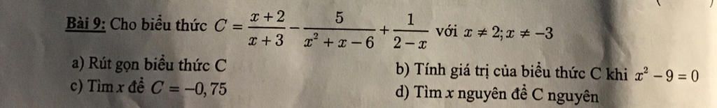 $9)\\ C=\dfrac{x+2}{x+3} -\dfrac{5}{x^2+x-6}+\dfrac{1}{2-x} (x\ne 2; x \ne -3)\\ a) C=\dfrac{x+2}{x+3} -\dfrac{5}{x^2+x-6}+\dfrac{1}{2-x} \\ =\dfrac{x+2}{x+3} -\dfrac{5}{(x^2-2x)+(3x-6)}-\dfrac{1}{x-2} \\ =\dfrac{x+2}{x+3} -\dfrac{5}{x(x-2)+3(x-2)}-\dfrac{1}{x-2} \\ =\dfrac{x+2}{x+3} -\dfrac{5}{(x+3)(x-2)}-\dfrac{1}{x-2} \\ =\dfrac{(x+2)(x-2)-5-(x+3)}{(x+3)(x-2)}\\ =\dfrac{x^2-4-5-x-3}{(x+3)(x-2)}\\ =\dfrac{x^2-x-12}{(x+3)(x-2)}\\ =\dfrac{(x^2-4x)+(3x-12)}{(x+3)(x-2)}\\ =\dfrac{x(x-4)+3(x-4)}{(x+3)(x-2)}\\ =\dfrac{(x+3)(x-4)}{(x+3)(x-2)}\\ =\dfrac{x-4}{x-2}\\ b) x^2-9=0\\ \Leftrightarrow x^2=9\\ \Leftrightarrow x= \pm 3\\ \circledast x=-3, C=\dfrac{-3-4}{-3-2}=\dfrac{7}{5}\\ \circledast x=3, C=\dfrac{3-4}{3-2}=-1\\ c) C=-0,75\\ \Leftrightarrow \dfrac{x-4}{x-2}=-0,75\\ \Leftrightarrow x-4=-0,75(x-2)\\ \Leftrightarrow x-4=-0,75x+1,5\\ \Leftrightarrow 1,75x=5,5\\ \Leftrightarrow x=\dfrac{22}{7}\\ d) C=\dfrac{x-4}{x-2}=\dfrac{x-2-2}{x-2}=1-\dfrac{2}{x-2}\\ x \in \mathbb{Z}, C \in \mathbb{Z}\\ \Rightarrow (x-2) \in Ư(2)\\ \Rightarrow (x-2) \in \{-2;-1;1;2\}\\ \Rightarrow x \in \{0;1;3;4\}.$