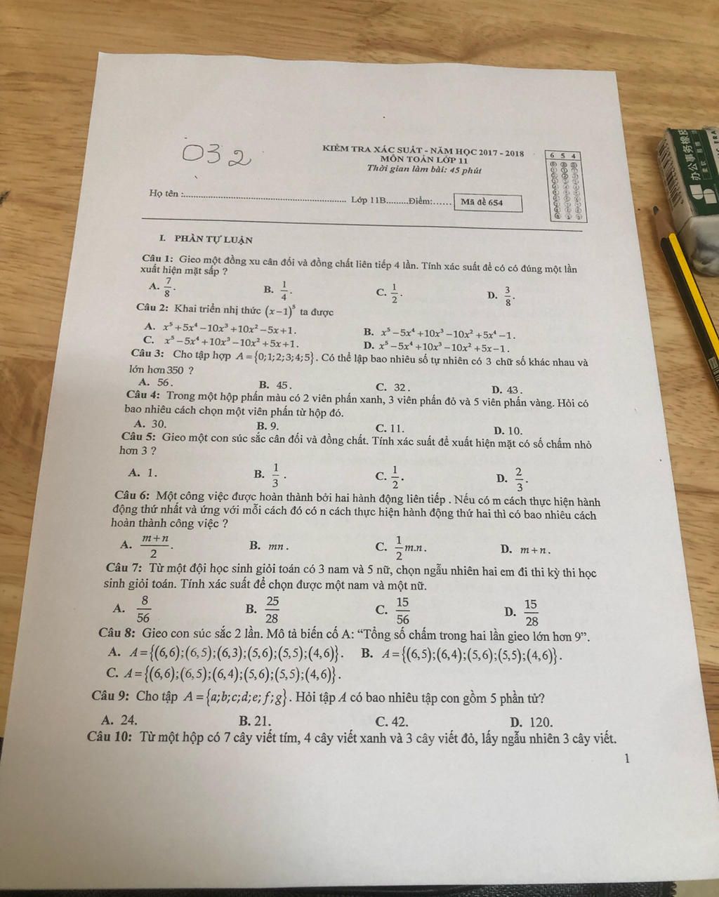 KIỂM TRA XÁC SUẤT - NĂM HỌC 2017 – 2018