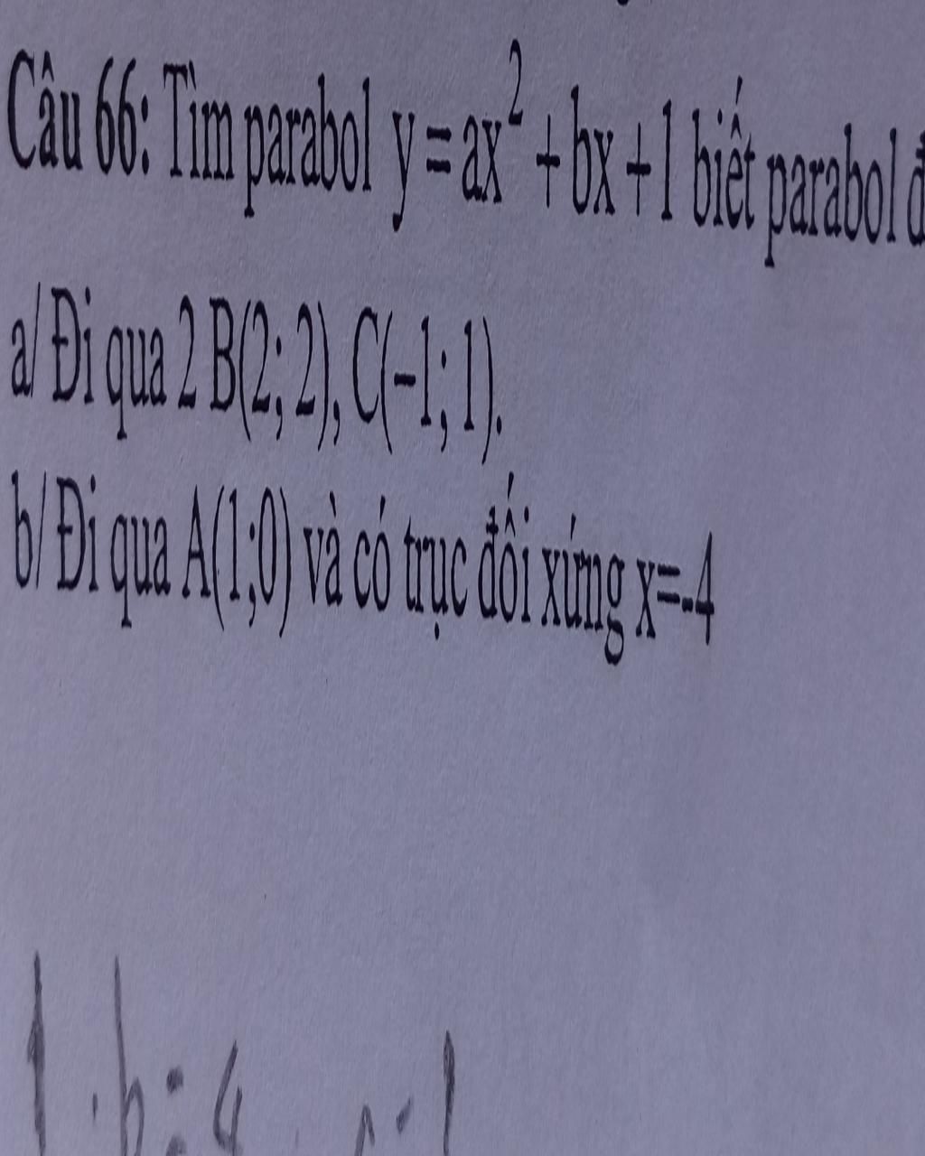 `b)`Vì Parabol `y=ax^{2}+bx+1` đi qua điểm `A(1; 0)` và có trục đối xứng là `x=-4`
