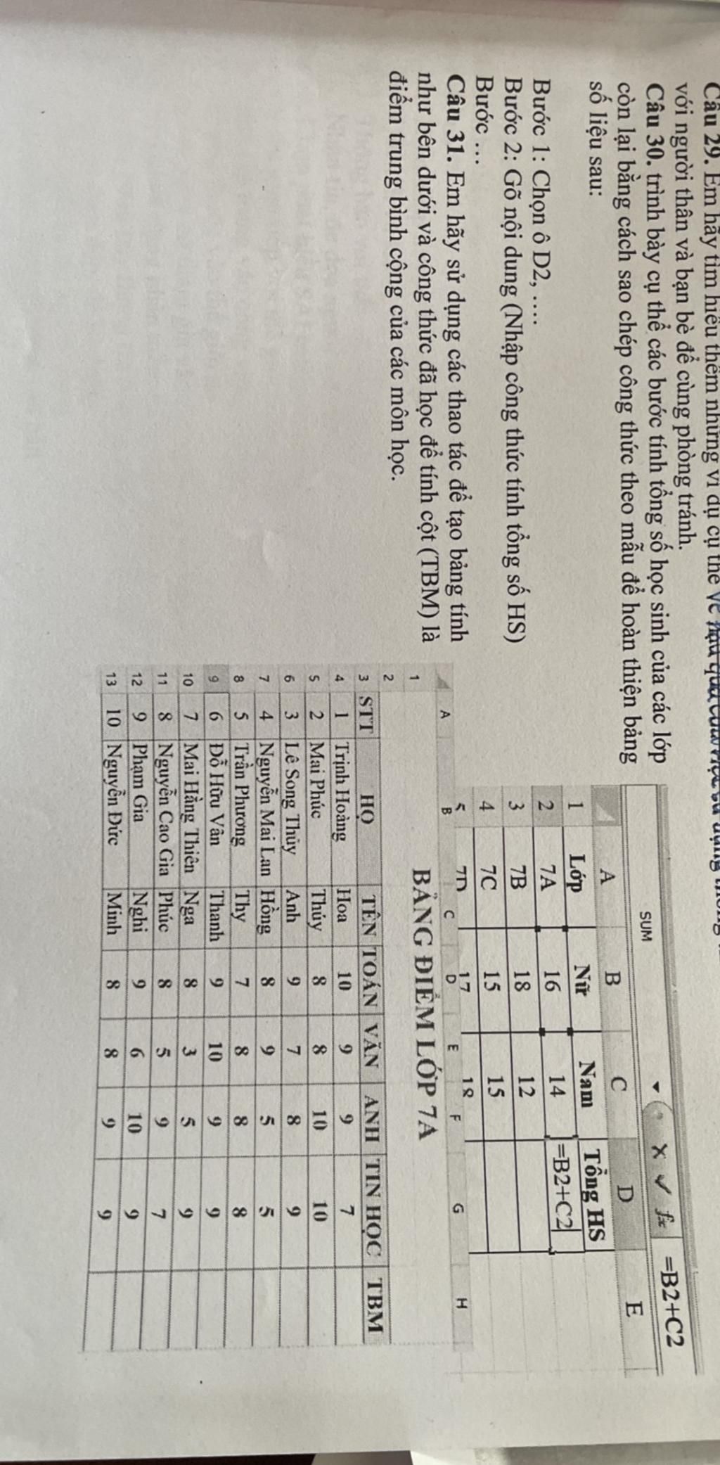 Câu 30. trình bày cụ thể các bước tính tổng số học sinh của các lớp