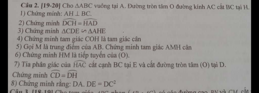 Câu 2. [19-20] Cho AABC vuông tại A. Đường tròn tâm O đường kính AC cắt BC tại H.