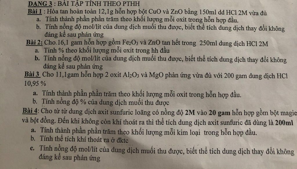 Bài 1 : Hòa tan hoàn toàn 12,1g hỗn hợp bột CuO và ZnO bằng 150ml dd HCl 2M vừa đủ