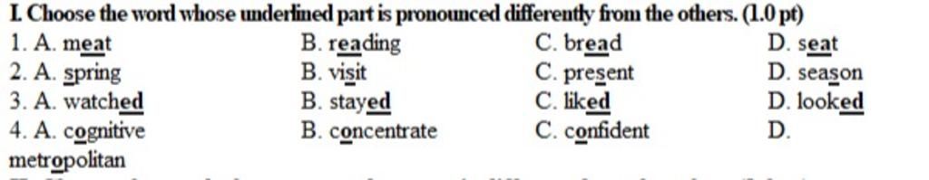 Câu 1 chọn C ( từ này phát âm là e còn các đáp án còn lại đều phát âm là i )