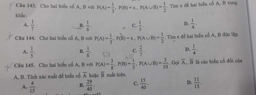 † Câu 143. Cho hai biến cố A, B với P(A) = , P(B)=x, P(AUB)== Tìm x để hai biến cố A, B xung