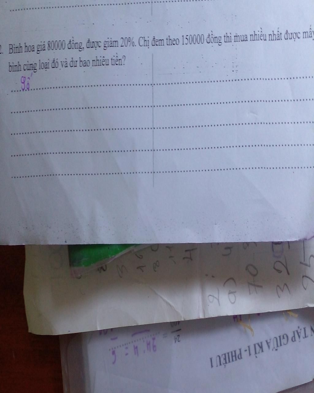 Bình hoa giá 80000 đồng được giảm 20% .Chị mang theo 150000 đồng thì mua được nhiều nhất được mấy bình cùng loại đó và dư bao nhiêu tiền.