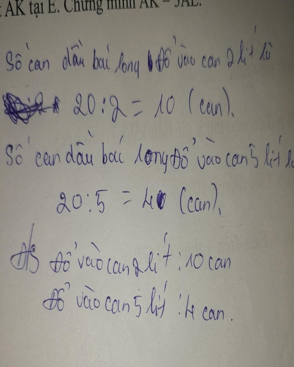 Bác Long rót 20 lít dầu vào các loại can 2 lít và 5 lít.Đố các bạn bác Long rót được bao nhiêu can 2 lít vào bao nhiêu can 5 lít