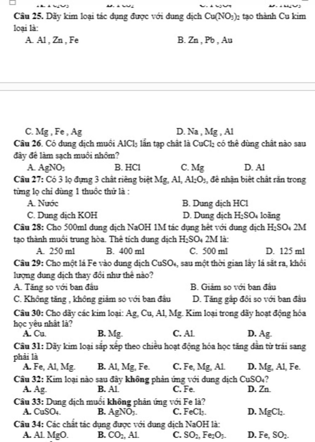 Câu 25. Dãy kim loại tác dụng được với dung dịch Cu(NO;): tạo thành Cu kim