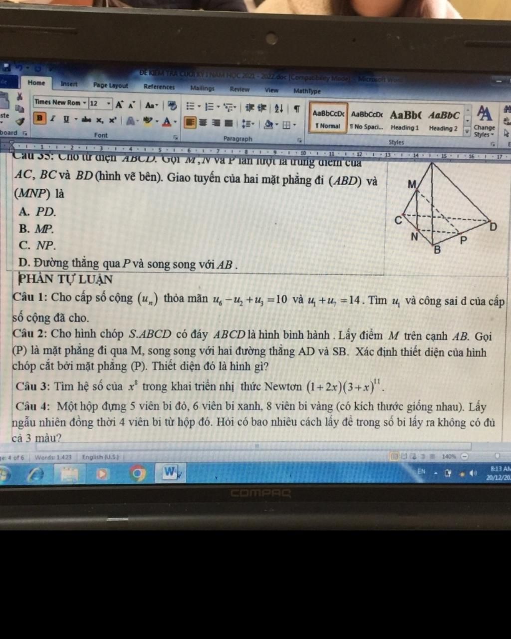 Câu 33: CHO từ đIện ABCD. GỌI M,IN Và P lần lượt là ...