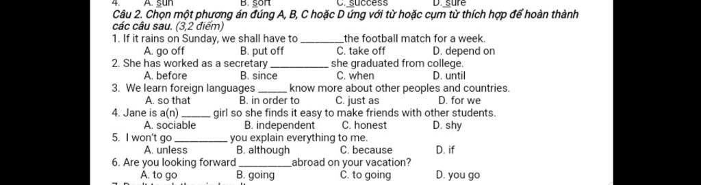 Câu 2. Chọn một phương án đúng A, B, C hoặc D ứng với từ hoặc cụm từ thích hợp để hoàn thành