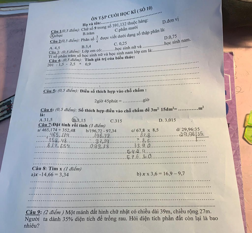 Câu 5 : 2 giờ 45 phút = 2,75 giờ