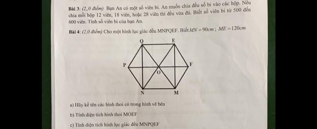 Bài 4: (2,0 điểm) Cho một hình lục giác đều MNPQEF. Biết MN =90cm ; ME=120cm ...